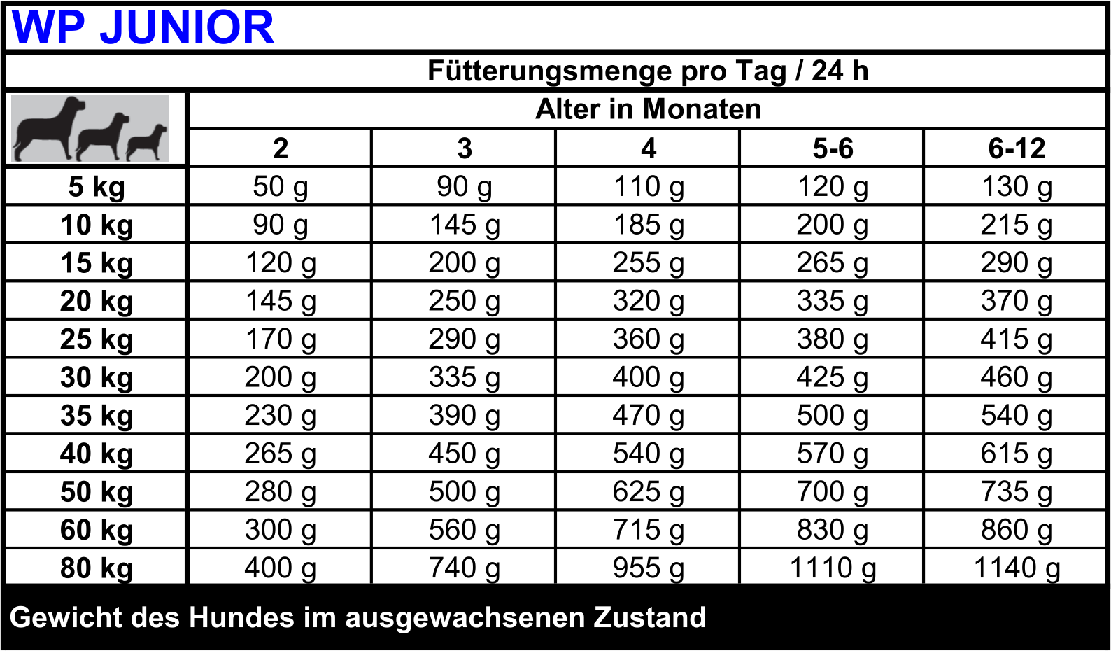 Die empfohlenen Angaben in der Fütterungstabelle sind Richtwerte, die je nach Alter, Veranlagung und Aktivität natürlichen Schwankungen unterliegen können und dem Ernährungszustand Ihres Hundes angepasst werden müssen. Wenn Ihr Welpe angemessen zunimmt, haben Sie die richtige Futtermenge für Ihren Hund gewählt.